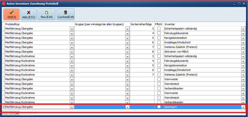 Für jedes Inventar erstellt man eine neue Zeile mit dem Typ "Mietfahrzeuge Übergabe".