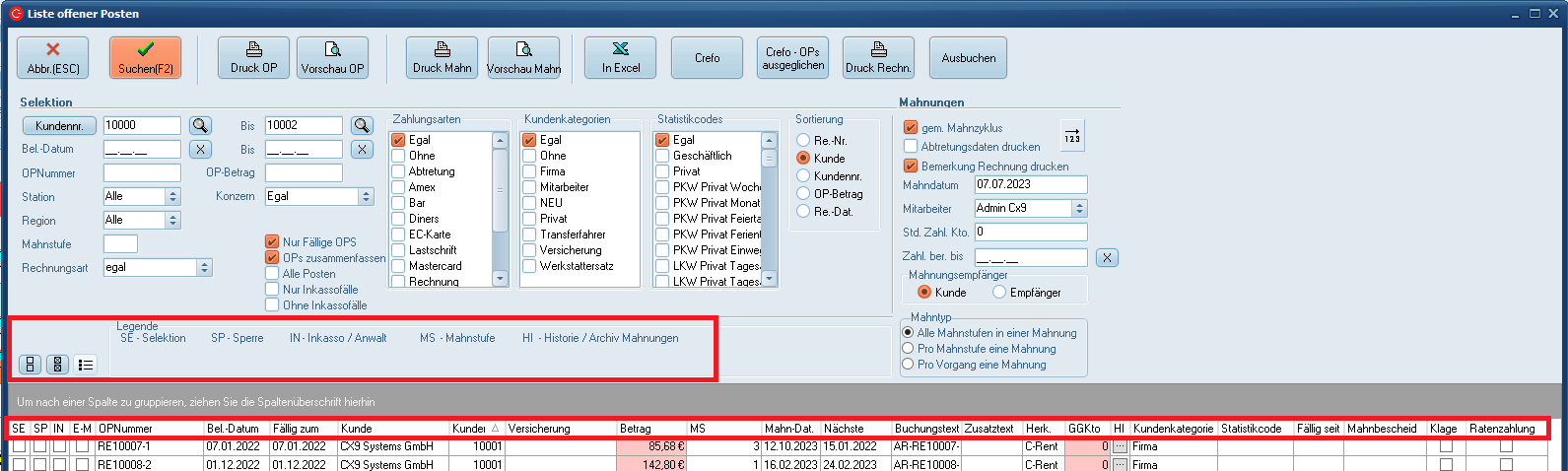 IN = Inkasso / Anwalt (markierte Vorgänge erlauben z.B. die Selektion nach "Nur Inkassofälle)
