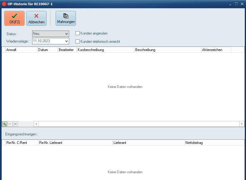 HI = Historie / Archiv Mahnungen (diese Spalte öffnet die OP Historie)