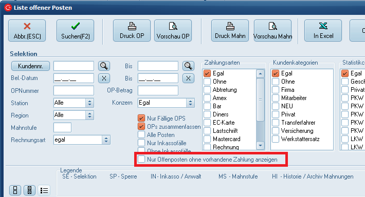 Nur Offeneposten ohne vorhandene Zahlung anzeigen = neuer Haken (ab V 6.23.2) der es erlaubt nur Offenposten ohne vorhandene Zahlung an zu zeigen