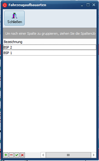 Hier können die Aufbauarten von Fahrzeugen hinzugefügt, bearbeitet und gelöscht werden.