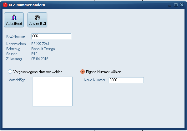 Menu -> Stammdaten -> Fahrzeuge -> Fahrzeugnummer ändern - Eigene Nummer wählen.