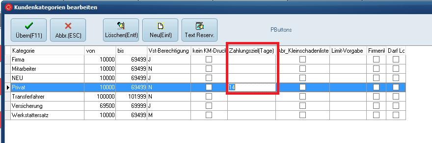 - In der Maske Kundenkategorien bearbeiten muss die Spalte „Zahlungsziel(Tage)“ befüllt sein.