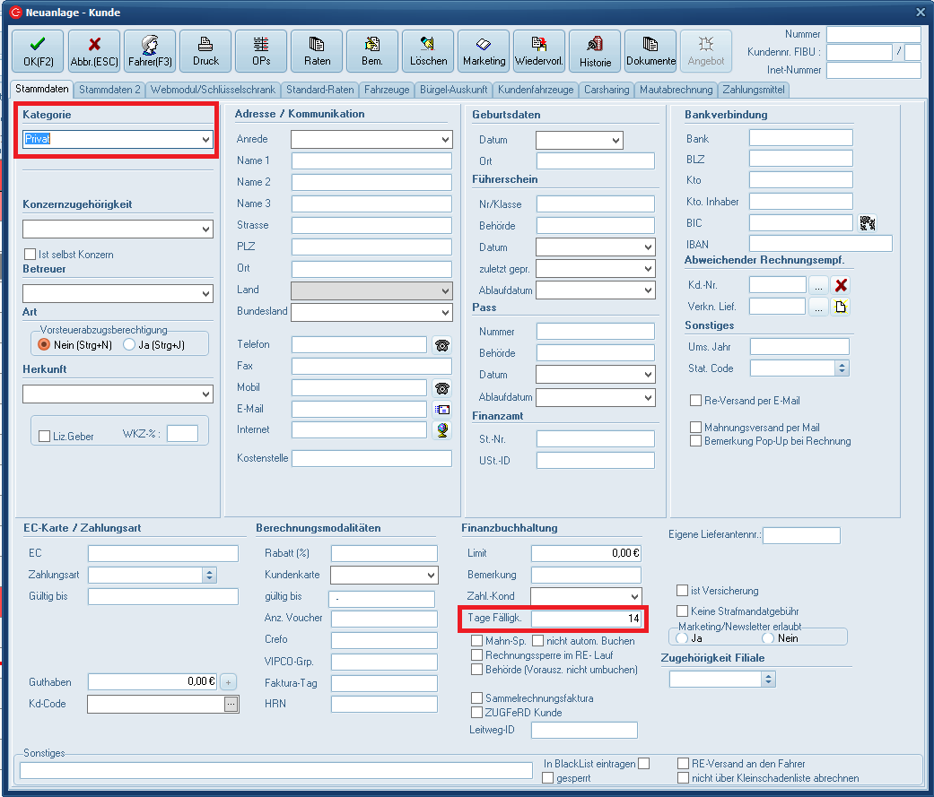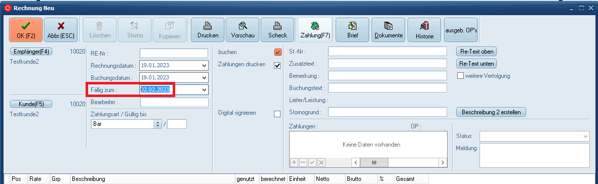 Bei Neuanlage eines Kunden in der entsprechenden Kategorie wird dann der Wert automatisch übernommen. Dieses Feld wird bei Rechnungserstellung wie folgt ermittelt: Rechnungsdatums + die Anzahl Tage, die im Kundenstamm beim Rechnungsempfänger im Feld „Tage Fälligk“ eingetragen sind.