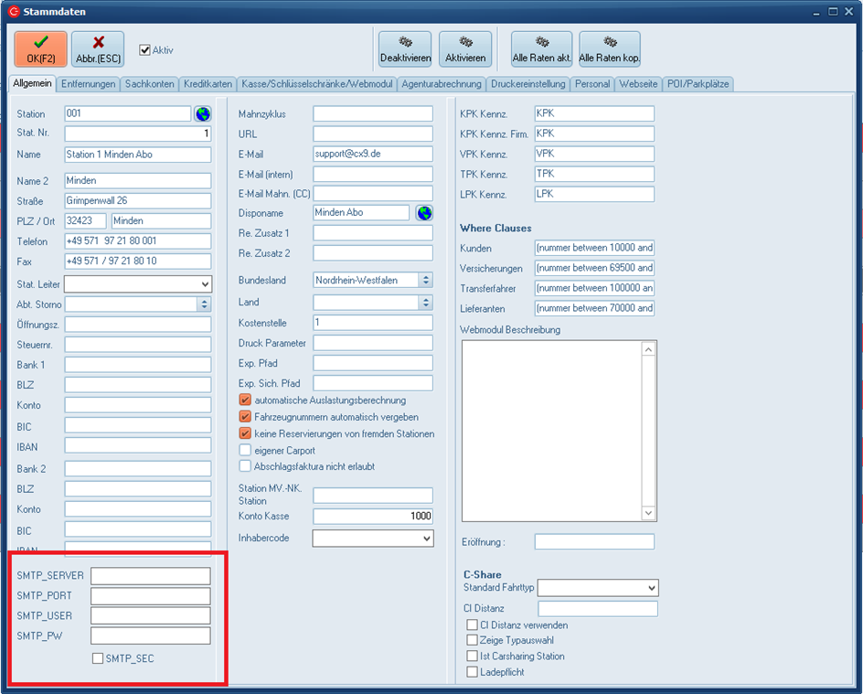 Ist in einem der beiden Bereiche ein Parameter nicht gefüllt, dann werden die Standard-Werte aus den Parametern verwendet. So können Sie z.B. für jede Station einen eigenen Benutzer verwenden, müssen aber nicht in jeder Station den Server hinterlegen.