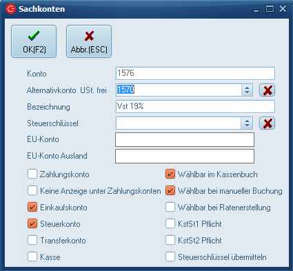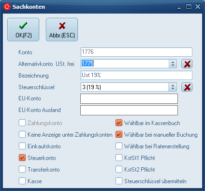 Hier prüfen Sie bitte je nach genutzten Sachkonterahmen, ob die notwendigen Steuerkonten angelegt und korrekt konfiguriert sind.