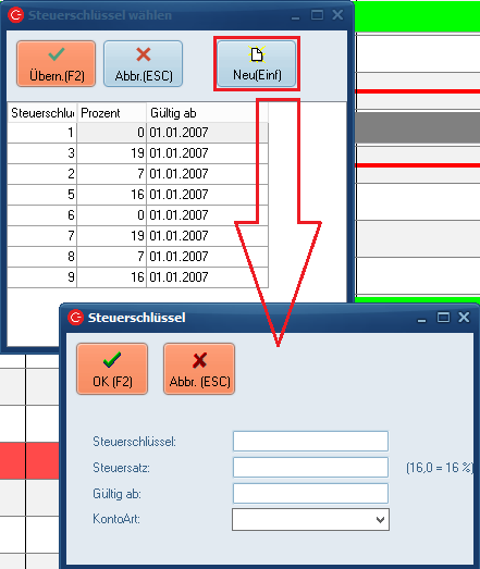 Um die bereits bestehenden Steuerschlüssel weiter zu nutzen legen Sie trotzdem einen neuen Steuerschlüssel (über den Button Neu) an der den gleichen Schlüssel enthält.