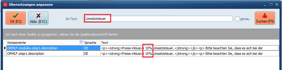 Die Umsatzsteuer wird in den Komponenten "ORMLF.modules.step1.description" und "ORMLF.step1.description" angegeben. Die Ziffern können Sie hier im Text einfach anpassen.