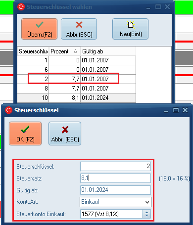Das C-Rent System zieht in unserem Beispiel nun ab den eingetragenen Gültigkeitsdatum (hier 01.01.24) automatisch den neuen Steuerschlüssel mit 8,1%.