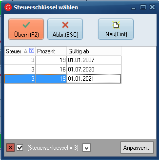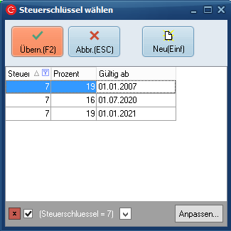 Sie können den Schlüssel nun ein weiteres Mal anlegen, so dass Sie auch die ursprünglichen Steuersätze ggf. später wieder nutzen können, wenn der Steuersatz zurückgestellt wird. Dieser muss dann ab dem Datum gültig sein, ab dem die Steuer wieder zurückgestellt wird.
