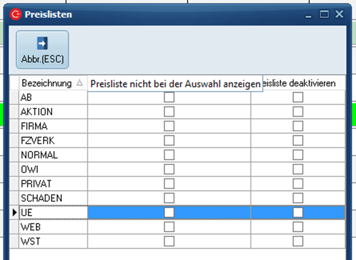 - Es muss eine Preisliste für UE Tarife angelegt werden. (Über Stammdaten > Tarife > Preislisten)