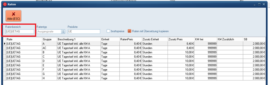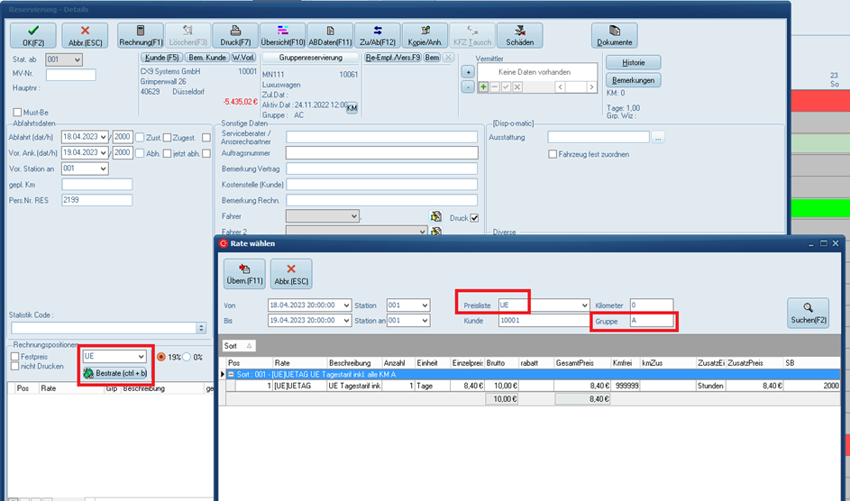 Wählen Sie im Reservierung (keine Gruppenreservierung) oder Vertrag die Preisliste für Unfallersatz (hier UE) aus und führen Sie die Bestrate aus. Es wird Ihnen nun der passende Tarif, für die im Fahrzeug gewählte UE-Gruppe, angezeigt.