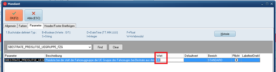- Im Parameter SBESTRATE_PREISLITSE_UEGRUPPE_FZG kann nun die Preisliste für UE hinterlegt werden (ohne Klammern). (Über Stammdaten > Unternehmensstruktur/Sonstiges > Mandant > Reiter Parameter)