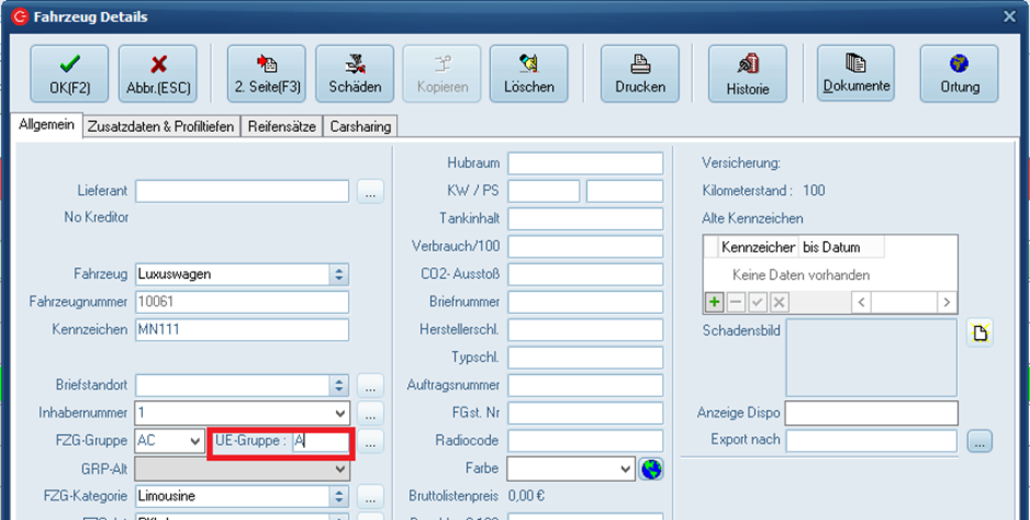 - Das Feld UE Gruppe muss im Fahrzeugstamm manuell befüllt sein.