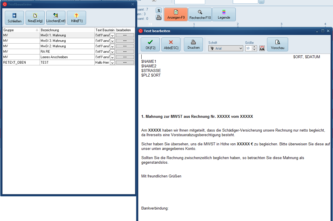 Hintergrund, generell kann die Splittabrechnung hier zwar genutzt werden, allerdings wird für die Steuer dann eine Splittabrechnung mit Buchung direkt auf das UST-Konto erzeugt. Dies vereinfacht zwar das Mahnwesen, aber das Problem ist, das dies rechtlich eigentlich nicht erlaubt ist und vom Finanzamt hinterfragt werden könnte. Diese Anleitung basiert darauf das die Splittabrechnung nicht genutzt wird. - Erstellen Sie eigene Textvorlagen (unter Stammdaten > Unternehmensstriktur/Sonstiges > Textbausteine) für die Kommunikation mit Versicherung, Rechtsanwalt oder zur Erstellung von Mahnungen anlegen.