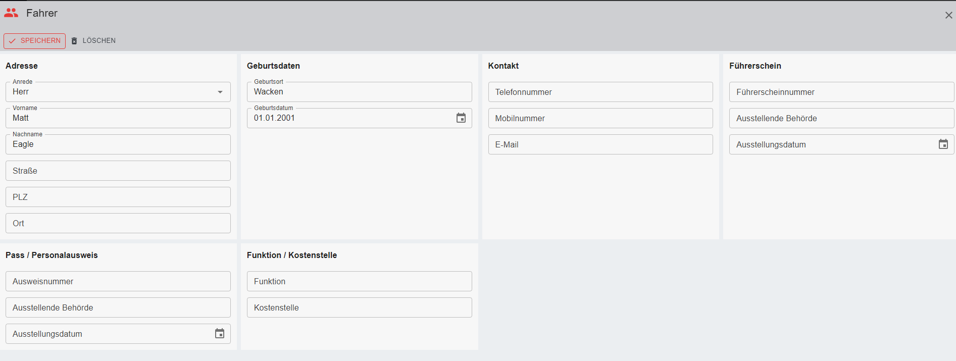 Wurde noch kein Fahrer angelegt, klickt man auf "neuen Fahrer anlegen" und man wird zu einer neuen Maske weitergeleitet.