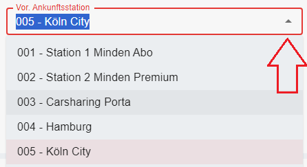 Hier wird die Station angezeigt, an der das Fahrzeug wieder übergeben wird. Für eine Anzeige weiterer Stationen kann das Drop-Down Feld genutzt werden.