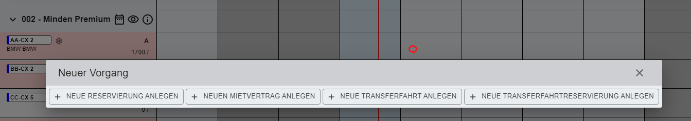 Ein Linksklick auf den Vorgang Fahrzeugreservierung zeigt das zugehörige Menü: