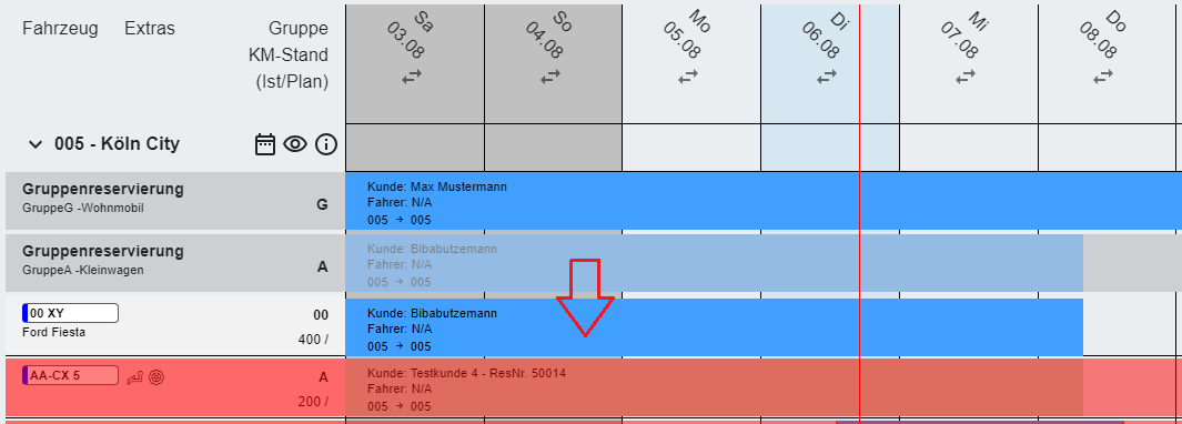 Reservierungen lassen sich vertikal auf andere Fahrzeuge oder auf die Station (Gruppenreservierung) verschieben, indem sie durch Klicken und Halten der linken Maustaste markiert werden. Ziehen der Maus über ein freies Feld und Loslassen der Maustaste platziert die Reservierung am neuen Ort. Auf diese Weise lassen sich z. B. Gruppenreservierungen einem bestimmten Fahrzeug zuordnen.