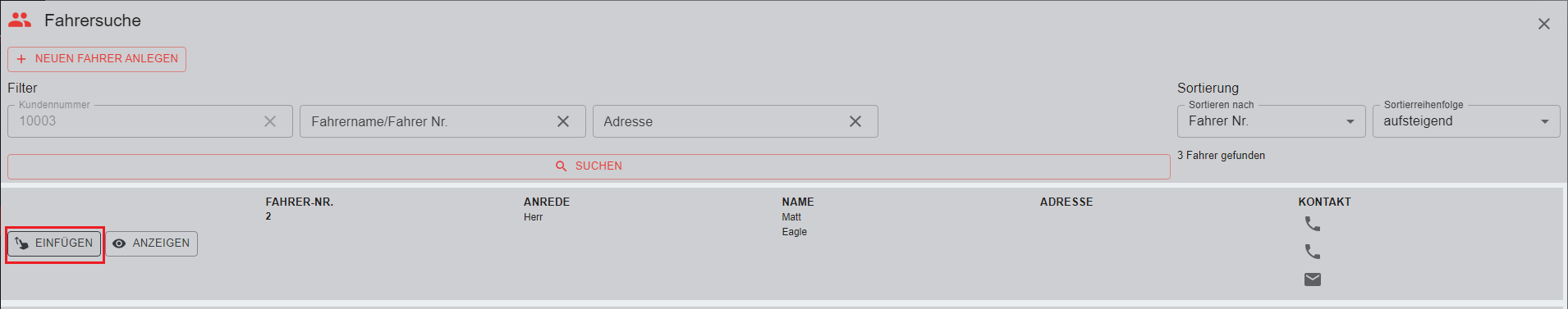 Sollte der Fahrer des KFZs eine andere Person als der Kunde sein (z.B. bei Firmen mit mehreren Mitarbeitern), kann man hier einen für diesen Mietvertrag gültigen Fahrer samt Kontaktdaten anlegen. Wurde bereits ein der Firma zugehörigen Fahrer angelegt, klickt man einfach auf den Button "einfügen" und wählt den betreffenden Fahrer aus der Suchmaske.