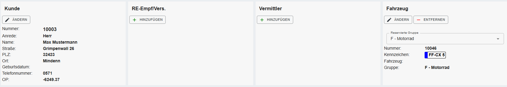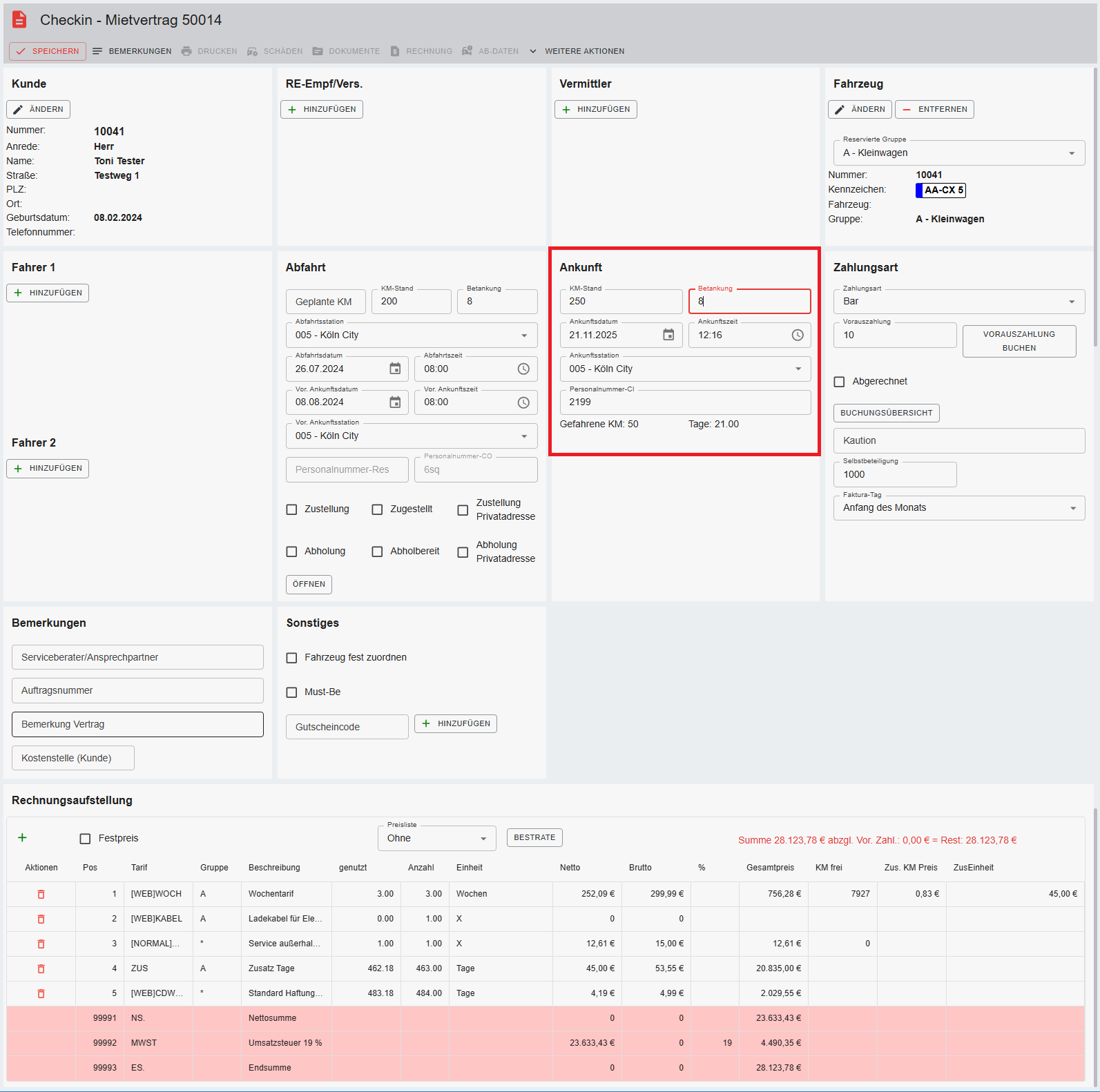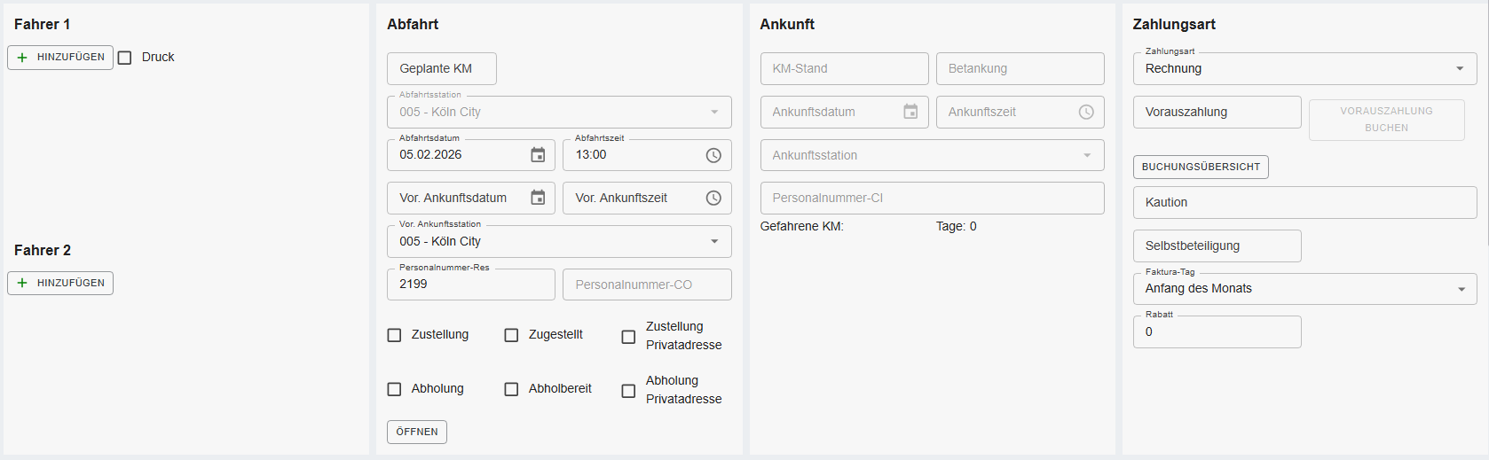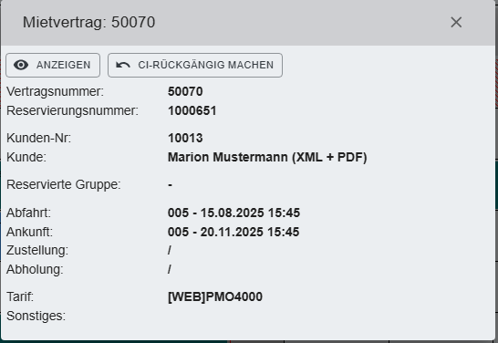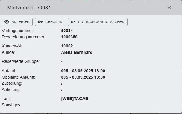 Anmerkung: Die folgenden Bereiche sind erst sichtbar, wenn der Mietvertrag eingecheckt wurde. Alle anderen Felder sind mit der Reservierungsmaske/ Mietvertragsmaske CO identisch.