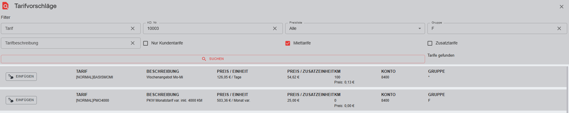 Es empfiehlt sich, die Option "Bestrate" auszuwählen, um den für den Kunden passenden Tarif zu bekommen. Wurde der Button betätigt, erscheinen in einem neuen Fenster die für den Kunden günstigsten Tarife.