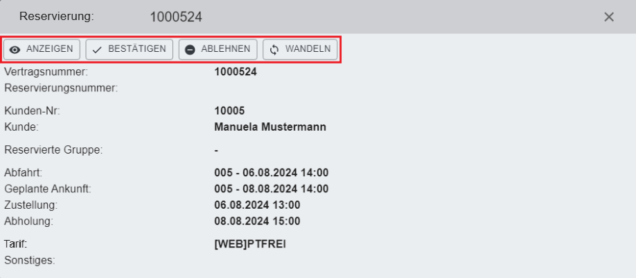 Anmerkung: Die folgenden Bereiche sind erst sichtbar, wenn eine Reservierung in Mietvertrag gewandelt wurde. Alle anderen Felder sind mit der Reservierungsmaske identisch.