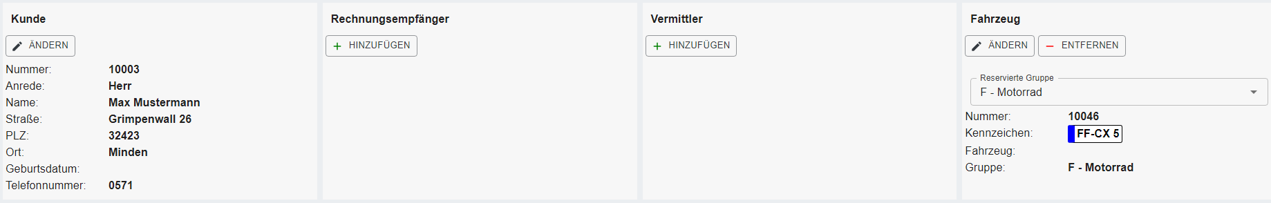 Anmerkung: Die folgenden Bereiche sind erst sichtbar, wenn eine Reservierung in Mietvertrag gewandelt wurde. Alle anderen Felder sind mit der Reservierungsmaske identisch.