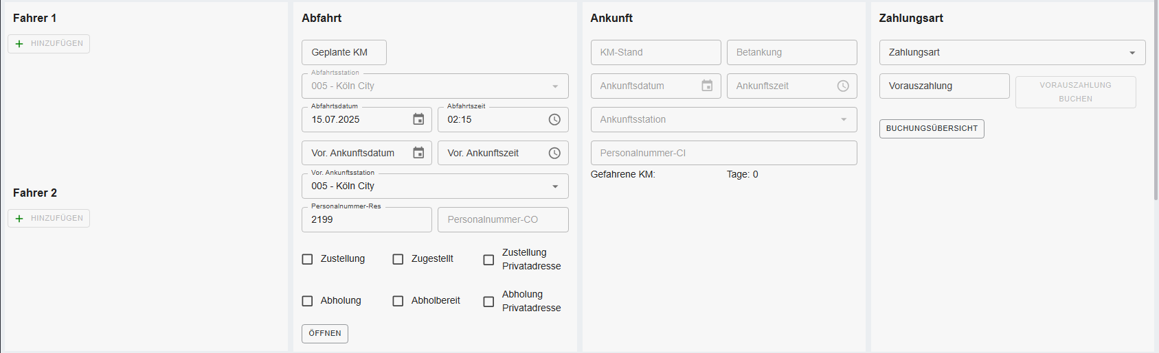 Hier lässt sich ein weiterer Fahrer angeben. Fahrer auswählen oder auf "neuen Fahrer anlegen" klicken, um einen neuen Fahrer einzugeben.