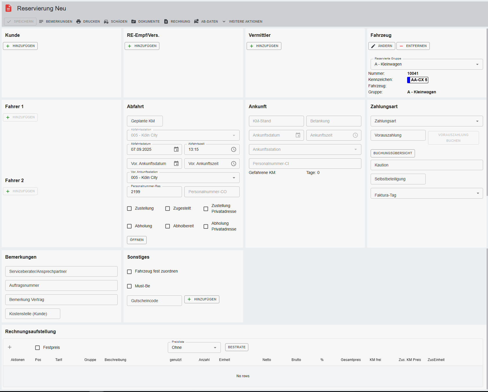 Anmerkung: Die folgenden Bereiche sind erst sichtbar, wenn der Mietvertrag eingecheckt wurde. Alle anderen Felder sind mit der Reservierungsmaske/ Mietvertragsmaske CO identisch.