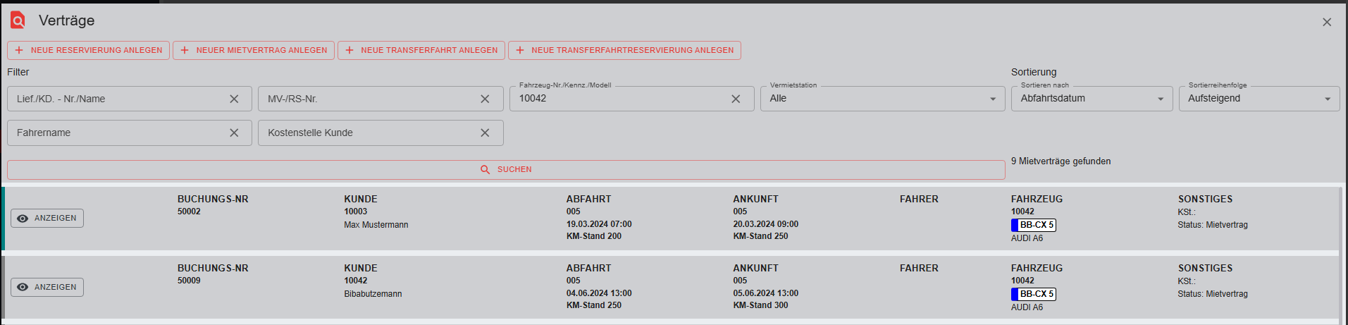 Das betätigen des Buttons führt zur Kundensuche, in welcher der zum Mietvertrag gehörende Kunde standardmäßig ausgewählt ist. So hat man nochmal die Möglichkeit, Kundendaten einzusehen oder zu ändern.