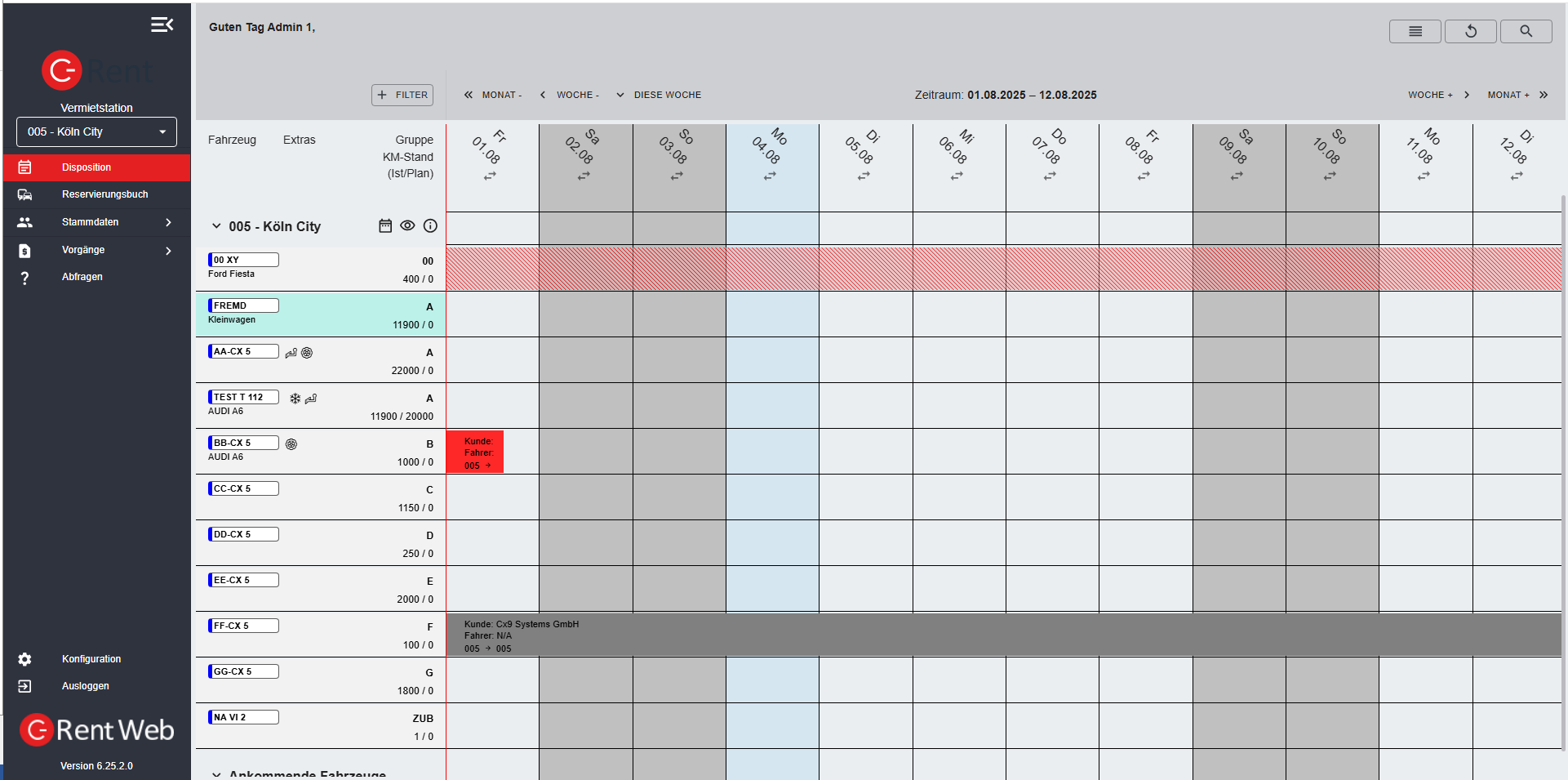 Das erste Fenster, das sich nach dem Anmelden in C-Rent Web 6 öffnet, ist die Disposition. Sie bietet einen Überblick über die Mietfahrzeuge, die an der Station zur Verfügung stehen und ihre jeweilige Verwendung im betrachteten Zeitraum. Von hier aus können alle weiteren Aktionen gestartet werden.