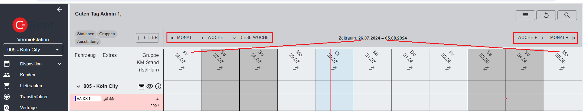 Das erste Fenster, das sich nach dem Anmelden in C-Rent Web 6 öffnet, ist die Disposition. Sie bietet einen Überblick über die Mietfahrzeuge, die an der Station zur Verfügung stehen und ihre jeweilige Verwendung im betrachteten Zeitraum. Von hier aus können alle weiteren Aktionen gestartet werden.