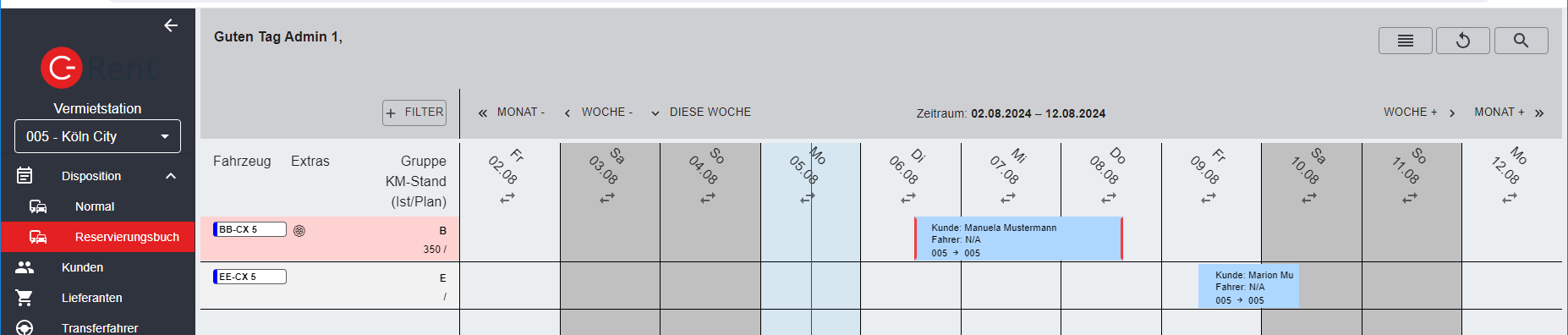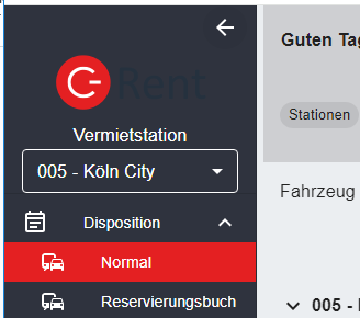Das erste Fenster, das sich nach dem Anmelden in C-Rent Web 6 öffnet, ist die Disposition. Sie bietet einen Überblick über die Mietfahrzeuge, die an der Station zur Verfügung stehen und ihre jeweilige Verwendung im betrachteten Zeitraum. Von hier aus können alle weiteren Aktionen gestartet werden.