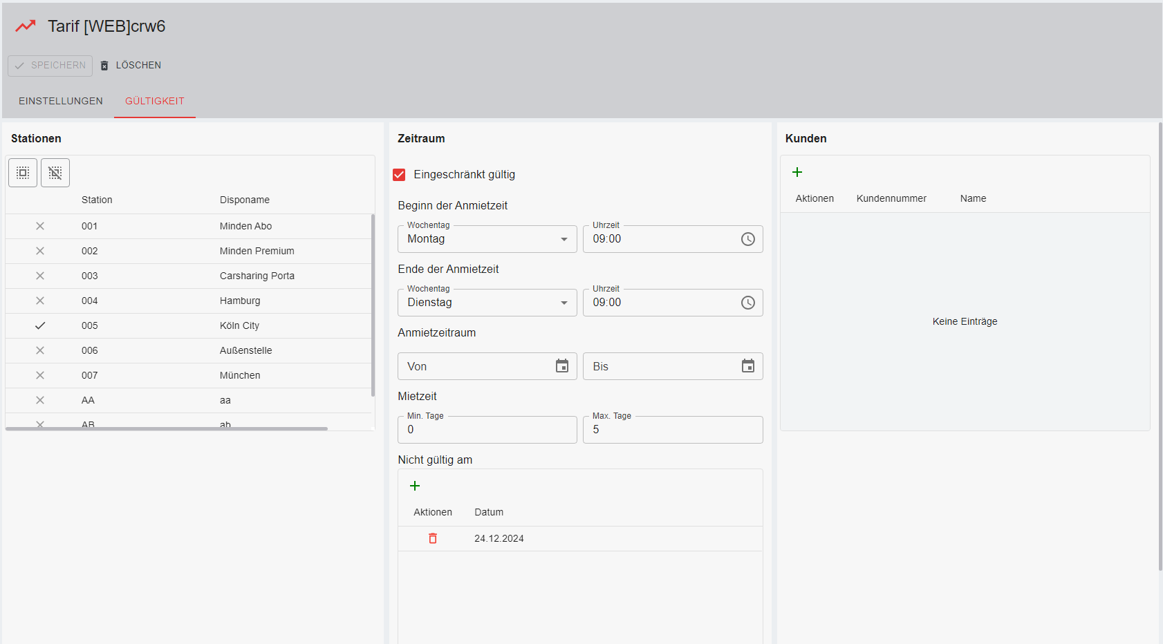 Wenn eine Vorlaufzeit für diese Station festgelegt werden soll, gibt man diese hier in Minuten ein. Soll also z. B. ein Tag Vorlauf für die Bereitstellung eines reservierten Fahrzeugs eingeräumt werden, muss hier die Zahl 1440 eingetragen werden. Wird in den Kundenstammdaten für einen spezifischen Kunden keine andere Vorlaufzeit vermerkt, wird die hier eingestellte Vorlaufzeit übernommen.
