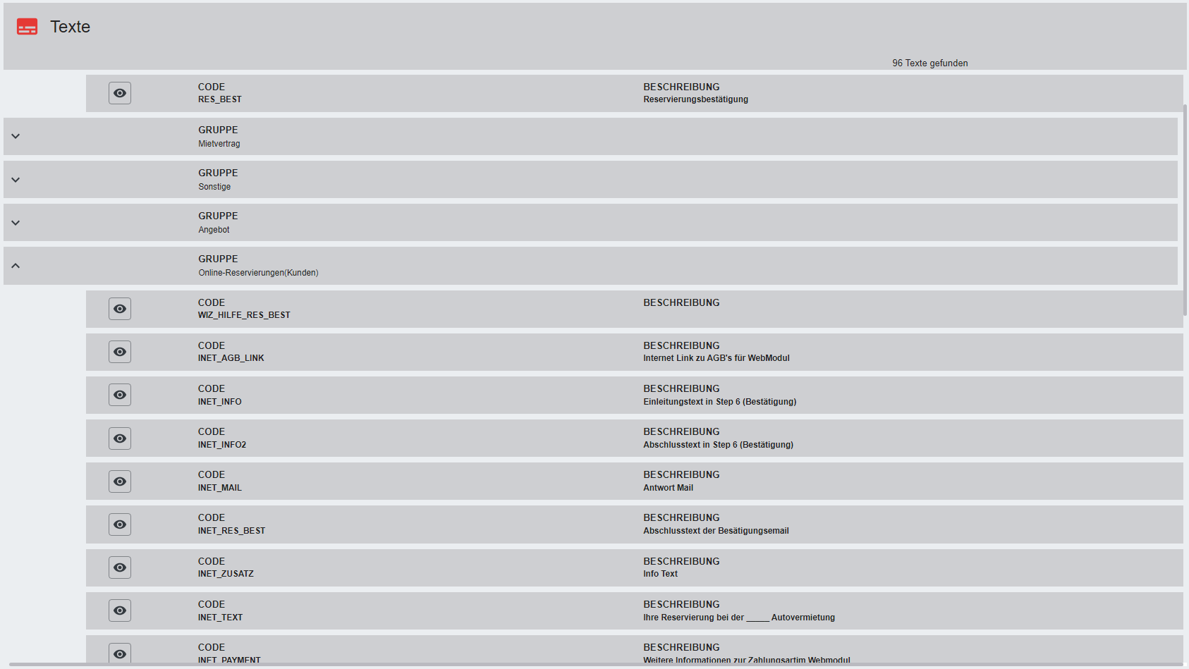 Klick auf "ANZEIGEN" führt in die Maske der jeweils ausgewählten Gruppe. Hier können Daten bei Bedarf geändert werden.