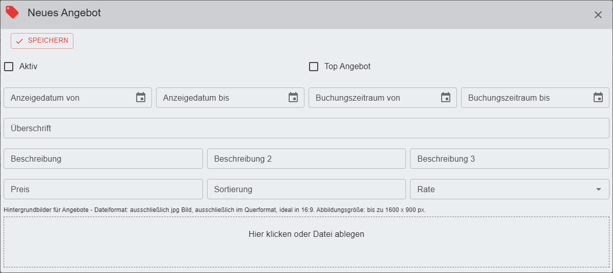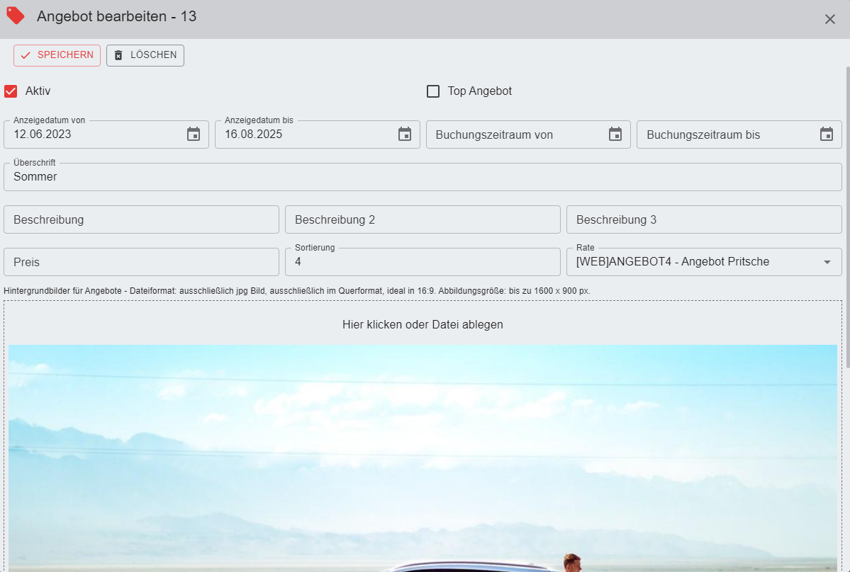 Damit das Angebot angezeigt werden kann muss der Haken "Aktiv" gesetzt werden.