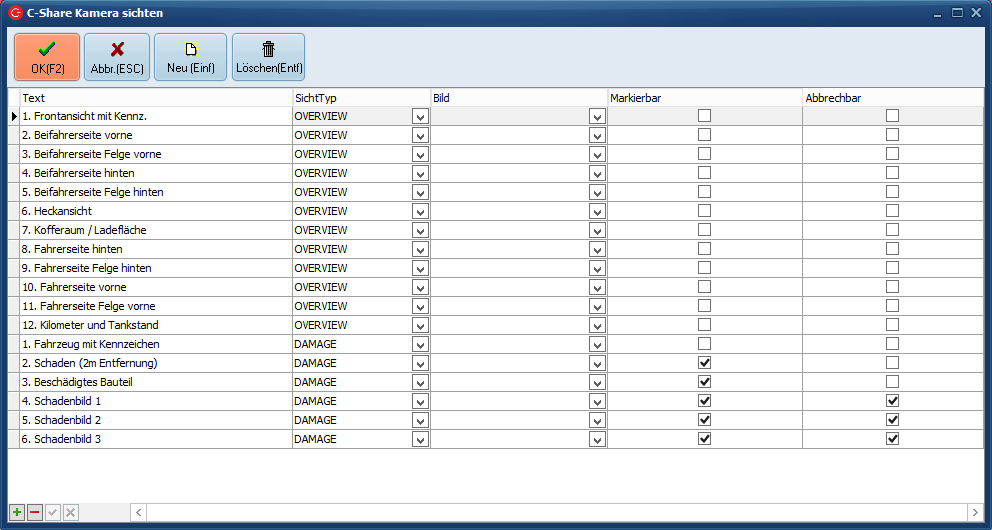 Mit dem SichtTyp OVERVIEW werden die Zustandsbilder gepflegt. Mit dem SICHTTYP DMAGE werden die Bilder bei Schäden gepflegt. Die Typen VERIFICATION wird bei Anmeldung in der APP und IDENTIFICATION wird bei Start der Fahrt abgefragt, Sinnvoll kann hier z.B. eine Foto des aktuell gültigen Führerscheins sein.