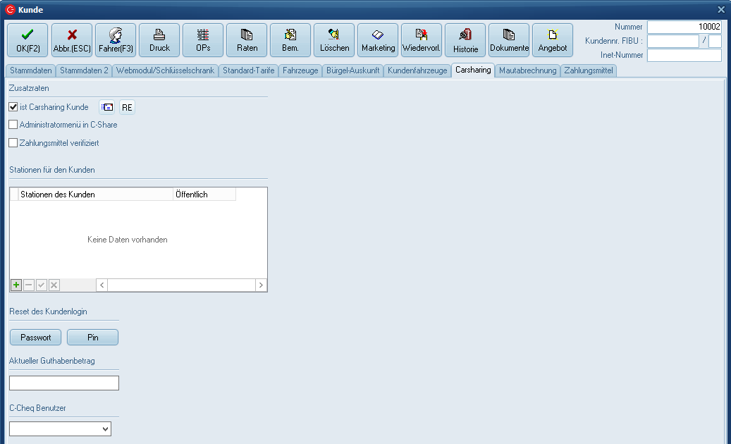 Damit der Kunde das Carsharing nutzen kann, muss der Haken gesetzt sein (dies kann automatisch oder manuell erfolgen, siehe Anleitung: Registrierung C-Share