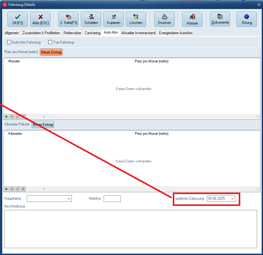 1150734 Für Modul AUTO ABO // Neues Feld "späteste Zulassung" in den Fahrzeugstamm eingebracht. Das ist das Datum, bis zu dem der Hersteller das KFZ maximal zulassen muss. Im Standard ist das ein rein plakatives Anzeigeelement im C-Rent, also ohne weitere Funktion. Bei Interesse wenden sie sich bitte an Ihren Kundenbeteuer.