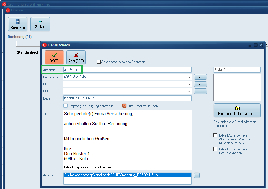 Dieser wird dann für Rechnungsversandt per Mail verwendet: