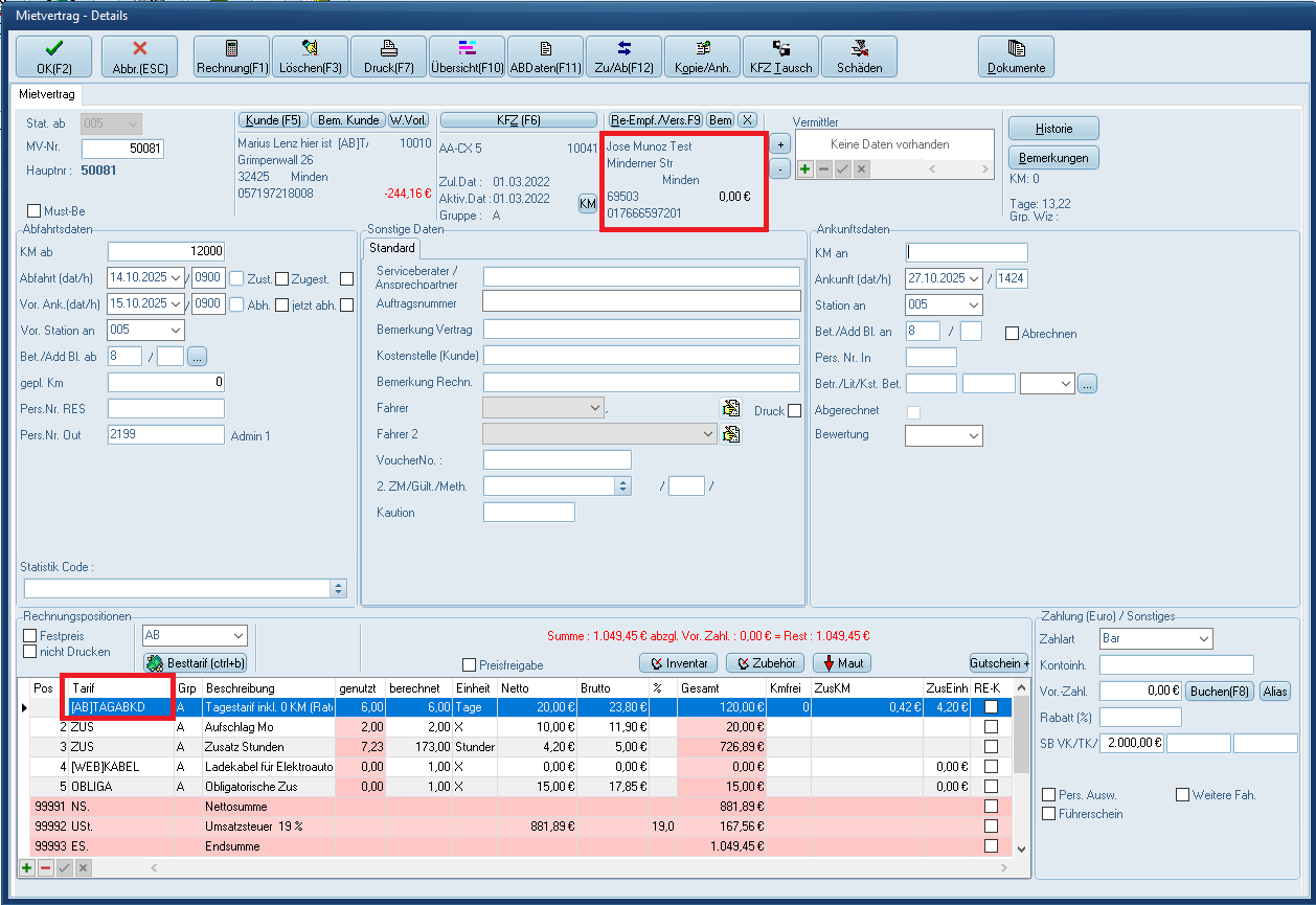 Im Mietvertrag mit Beispieltarif [AB]TAGABKD wird der Abweichende Rechnungsempfänger automatisch beim Speichern des Vorgangs befüllt. Bei erneutem Aufruf des Vorgangs wird nun der Re-Empfänger im Vorgang angezeigt: