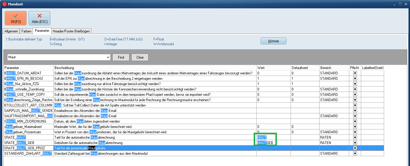 Der Mauttarif wird anschließend im Parameter "SRATE_MAUT" hinterlegt.
