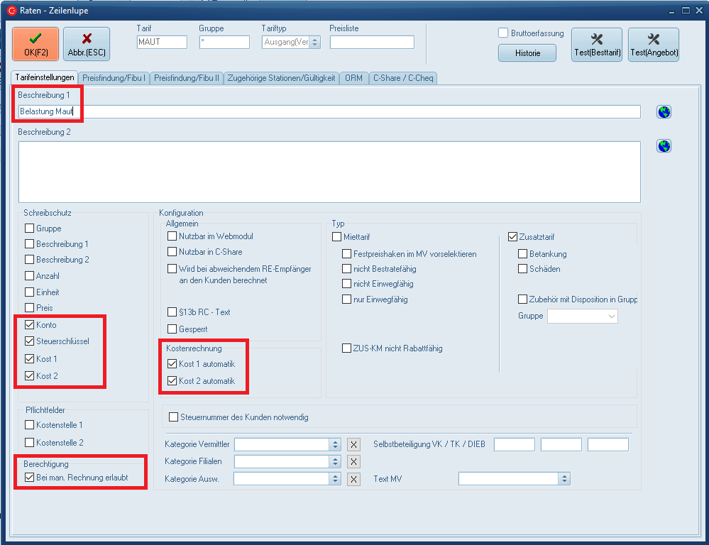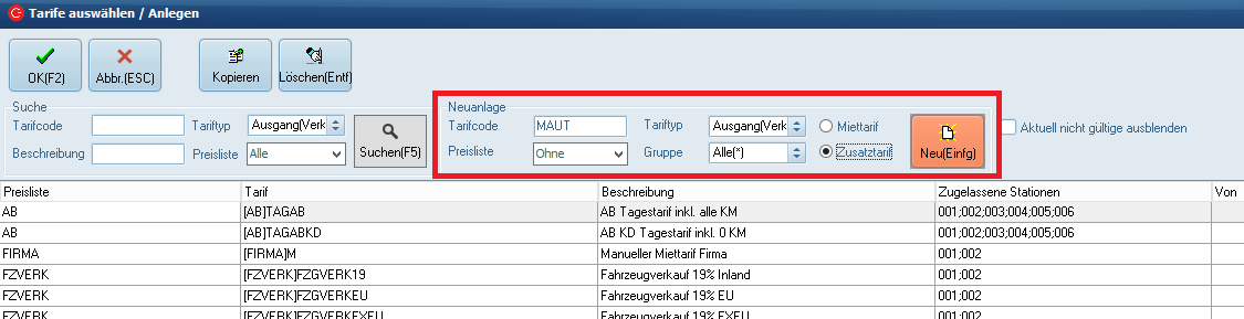 Für Firmenkunden können die Tarife "MAUT" und "MAUTGEB" kopiert und mit einem anderen Erlöskonto z.B. ohne UST genutzt werden.