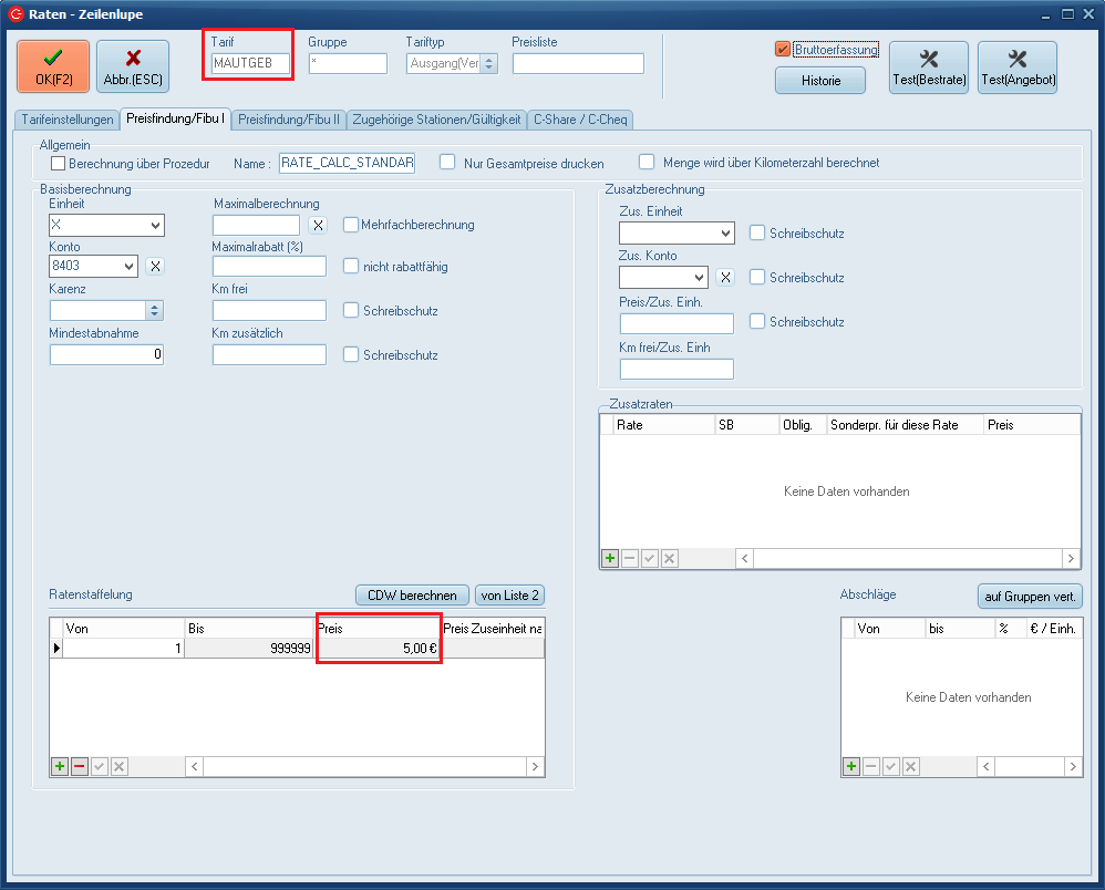 Wenn Sie zusätzlich eine Mautgebühr berechnen möchten so können Sie einen weitern Zusatztarif (z.B. MAUTGEB) anlegen.