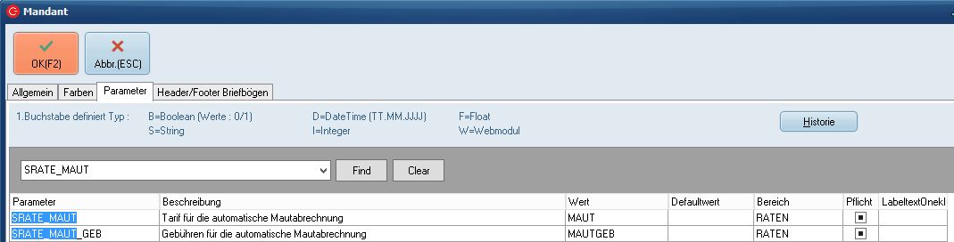 Falls zusätzliche Gebühren für das Abrechnen der Maut erhoben werden sollen, muss dafür eine separate Rate (z.B. Geb. Maut) angelegt werden und im Parameter „SRATE_MAUT_GEB“ hinterlegt sein.