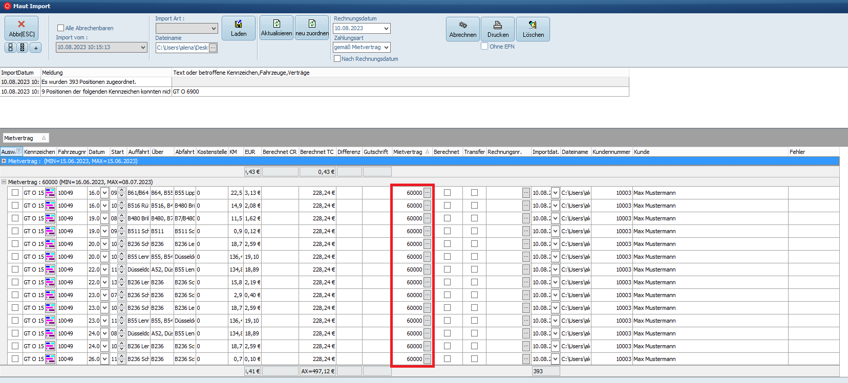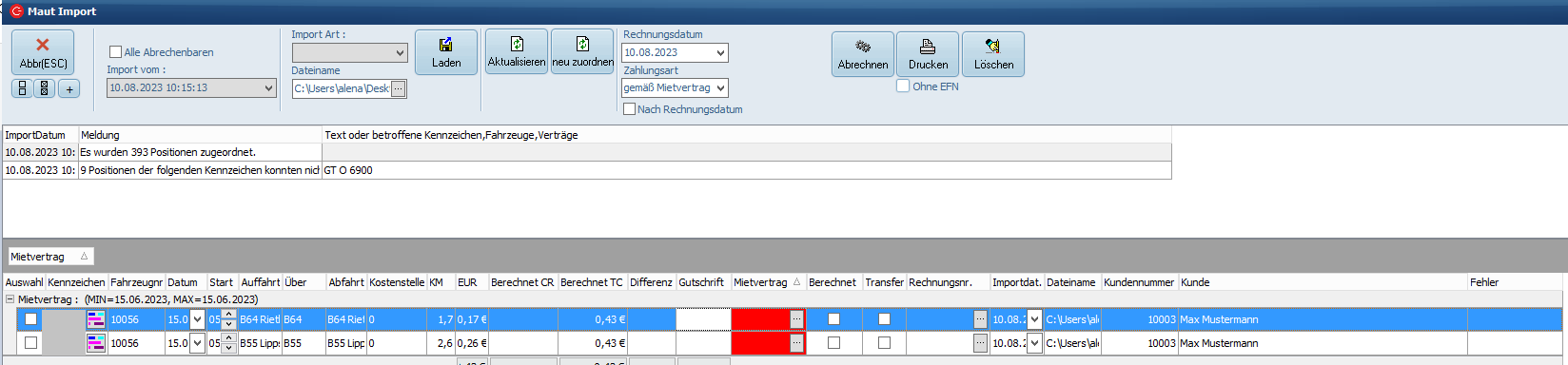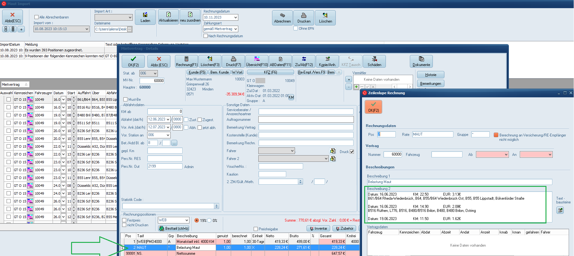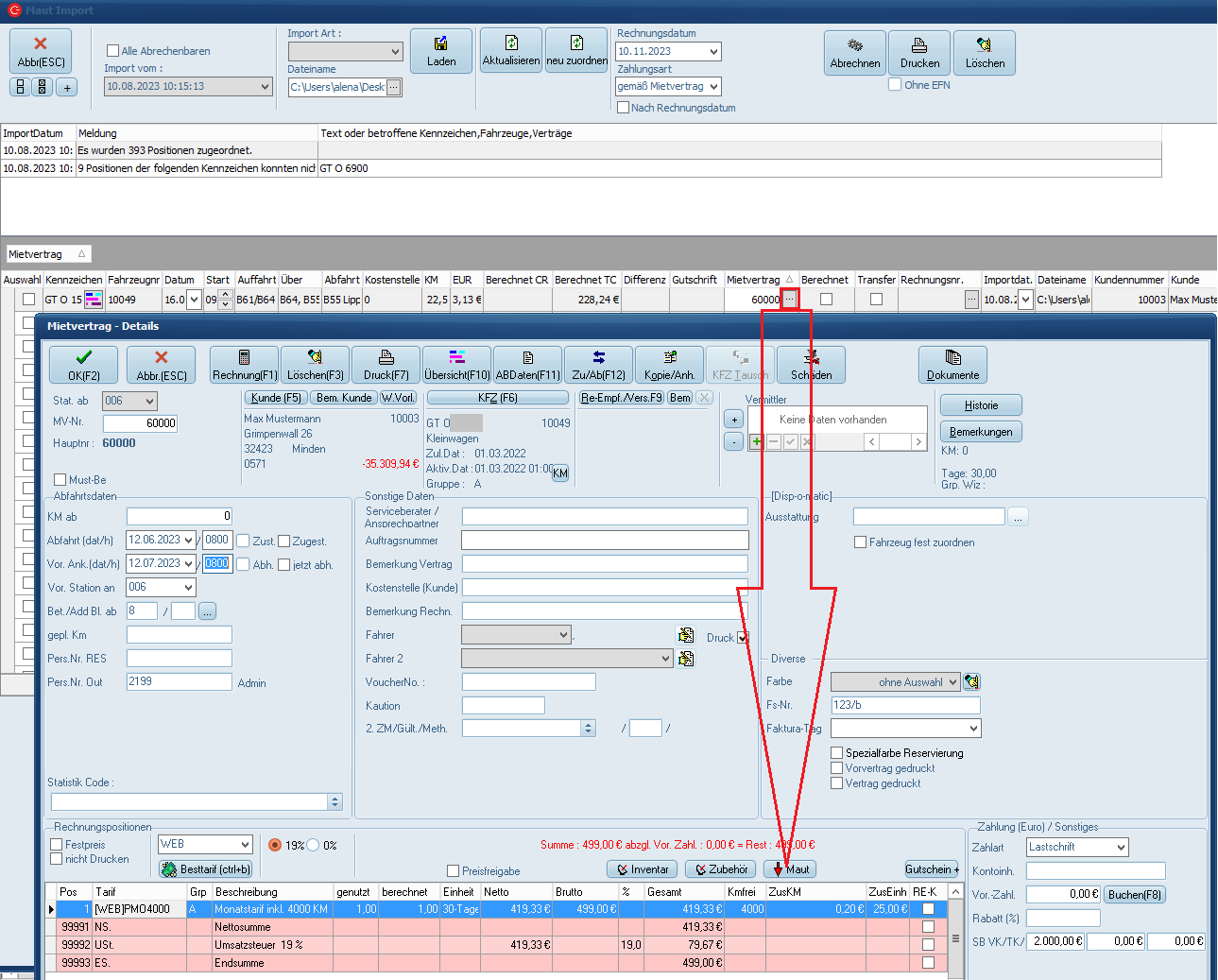 Alternativ kann die Maut auch in den Mietvertrag übertragen werden. Die Abrechnung erfolgt dann über die Rechnung im Mietvertrag und nicht in einer gesonderten Rechnung über den Lauf. Lesen Sie wie gewohnt die Mautdatei ein, so dass die Mietverträge den Vorgängen zugeordnet werden. (Der Vorgang darf natürlich noch nicht abgerechnet worden sein.)