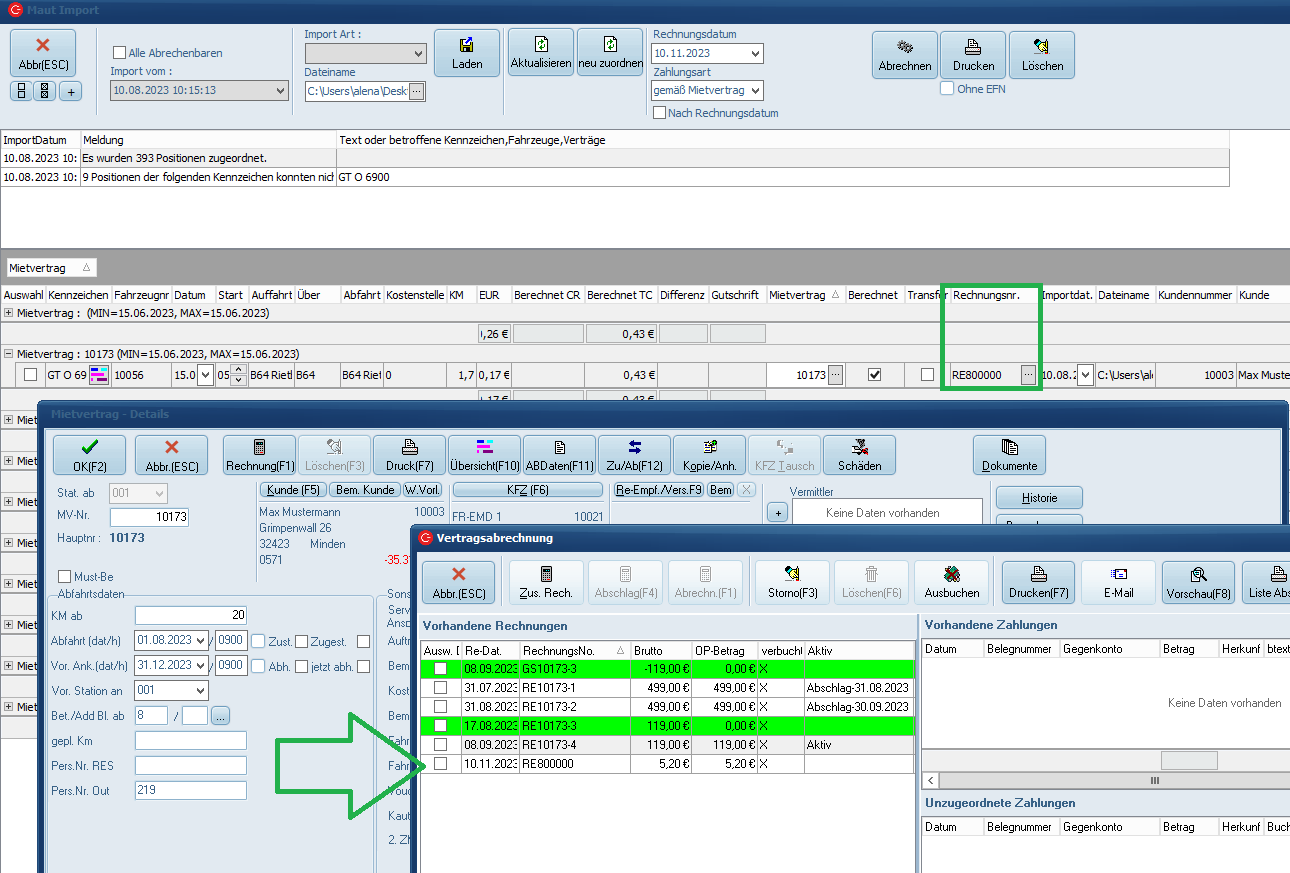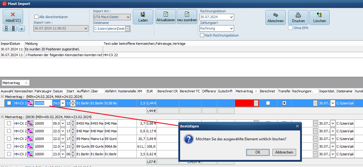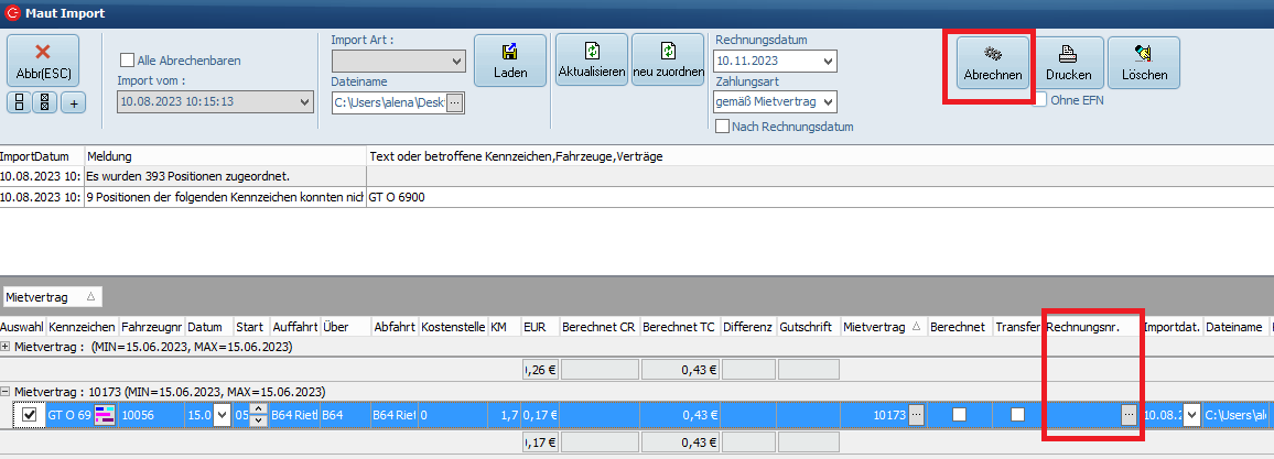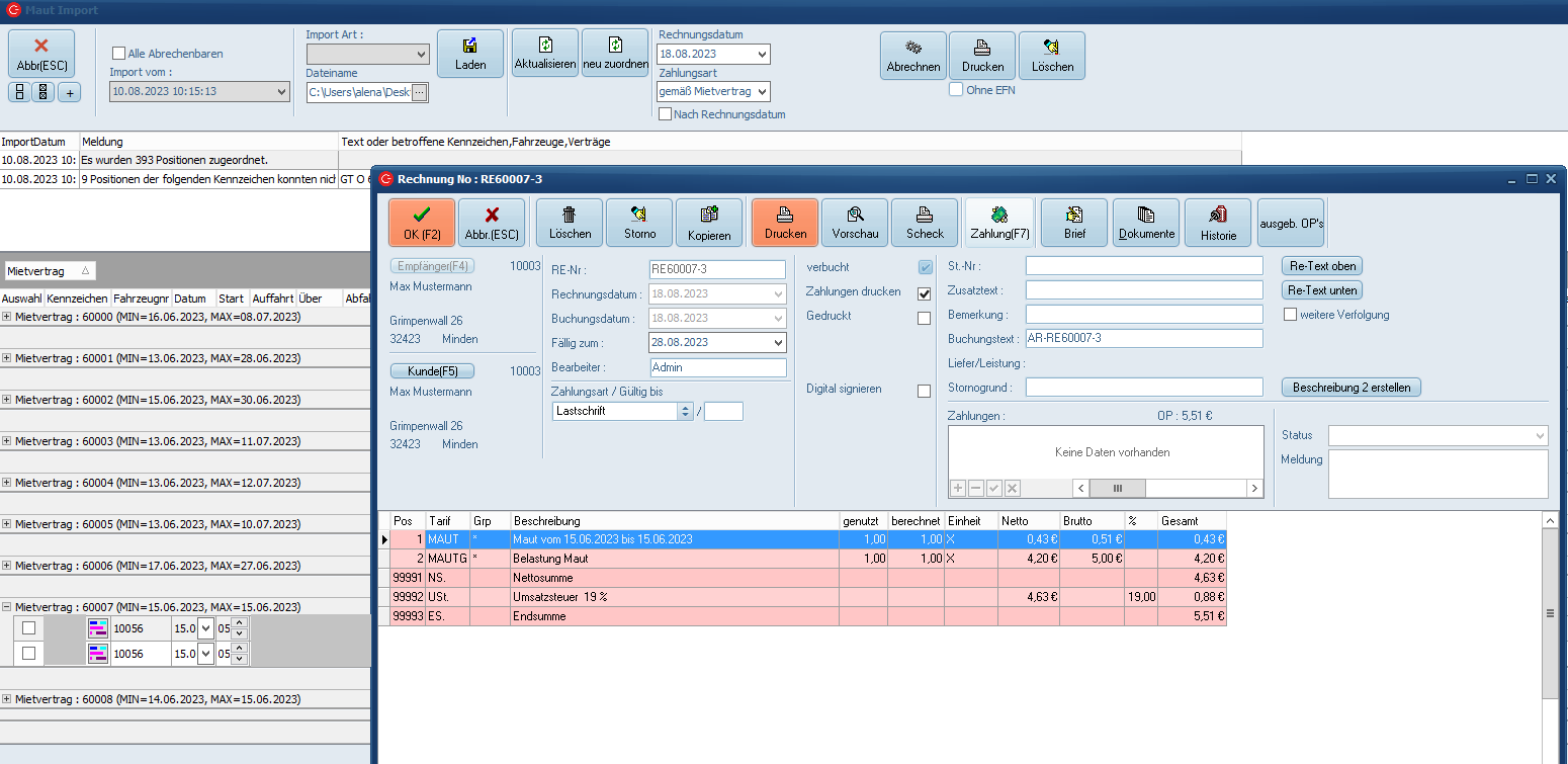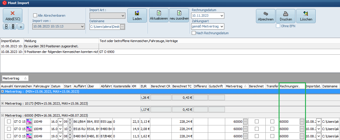 Alternativ kann die Maut auch in den Mietvertrag übertragen werden. Die Abrechnung erfolgt dann über die Rechnung im Mietvertrag und nicht in einer gesonderten Rechnung über den Lauf. Lesen Sie wie gewohnt die Mautdatei ein, so dass die Mietverträge den Vorgängen zugeordnet werden. (Der Vorgang darf natürlich noch nicht abgerechnet worden sein.)