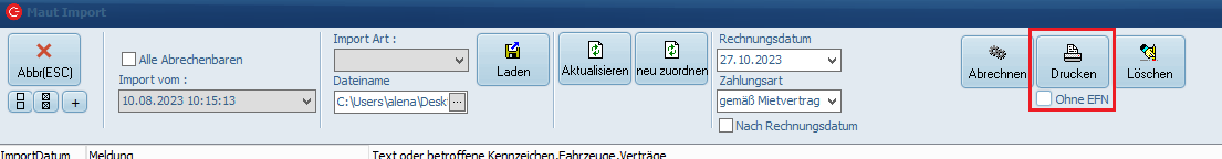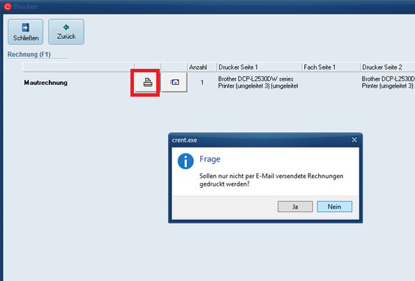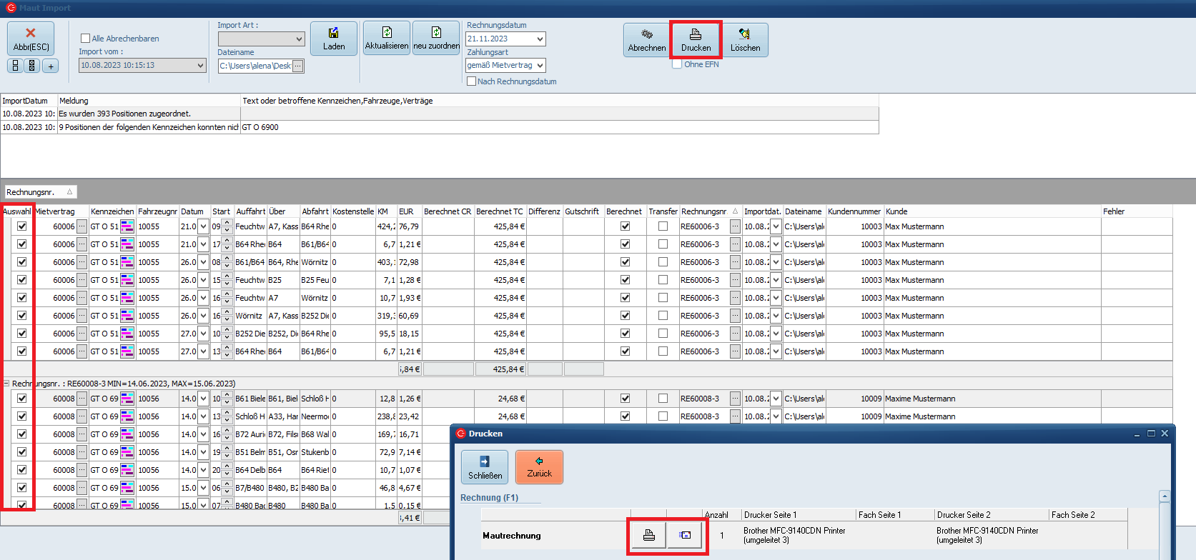 Der Druck-Button druckt ALLE markierten Mautrechnungen, per Mail oder über den Drucker.