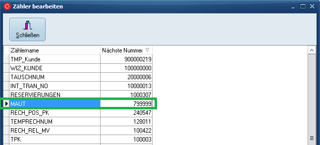 Mit Klick auf "einfg" auf der Tastatur wird eine neue Zeile hinzugefügt. Zählername muss mit "MAUT" eingegeben werden. In der Spalte "Nächste Nummer" wird der Zähler eingetragen.